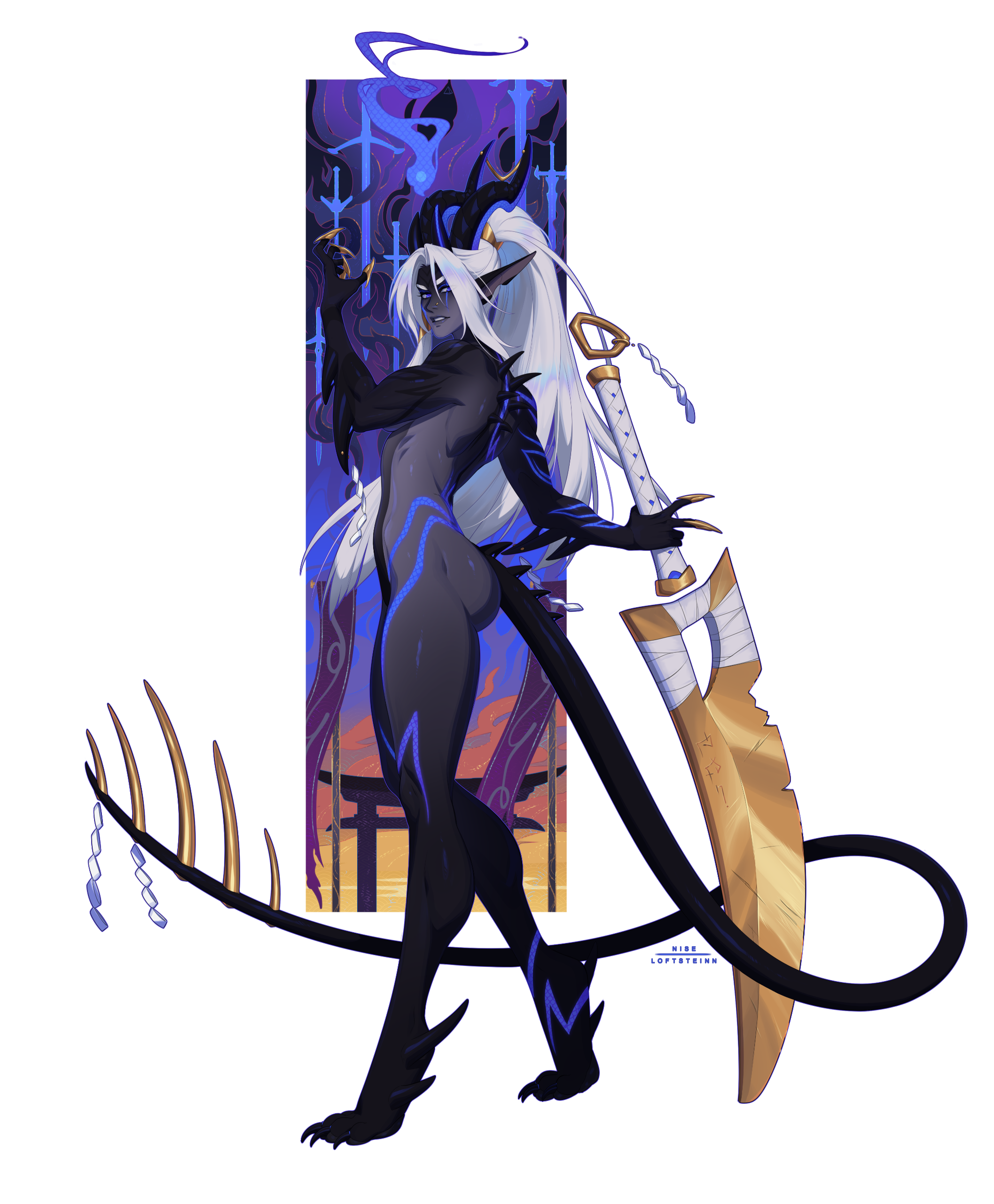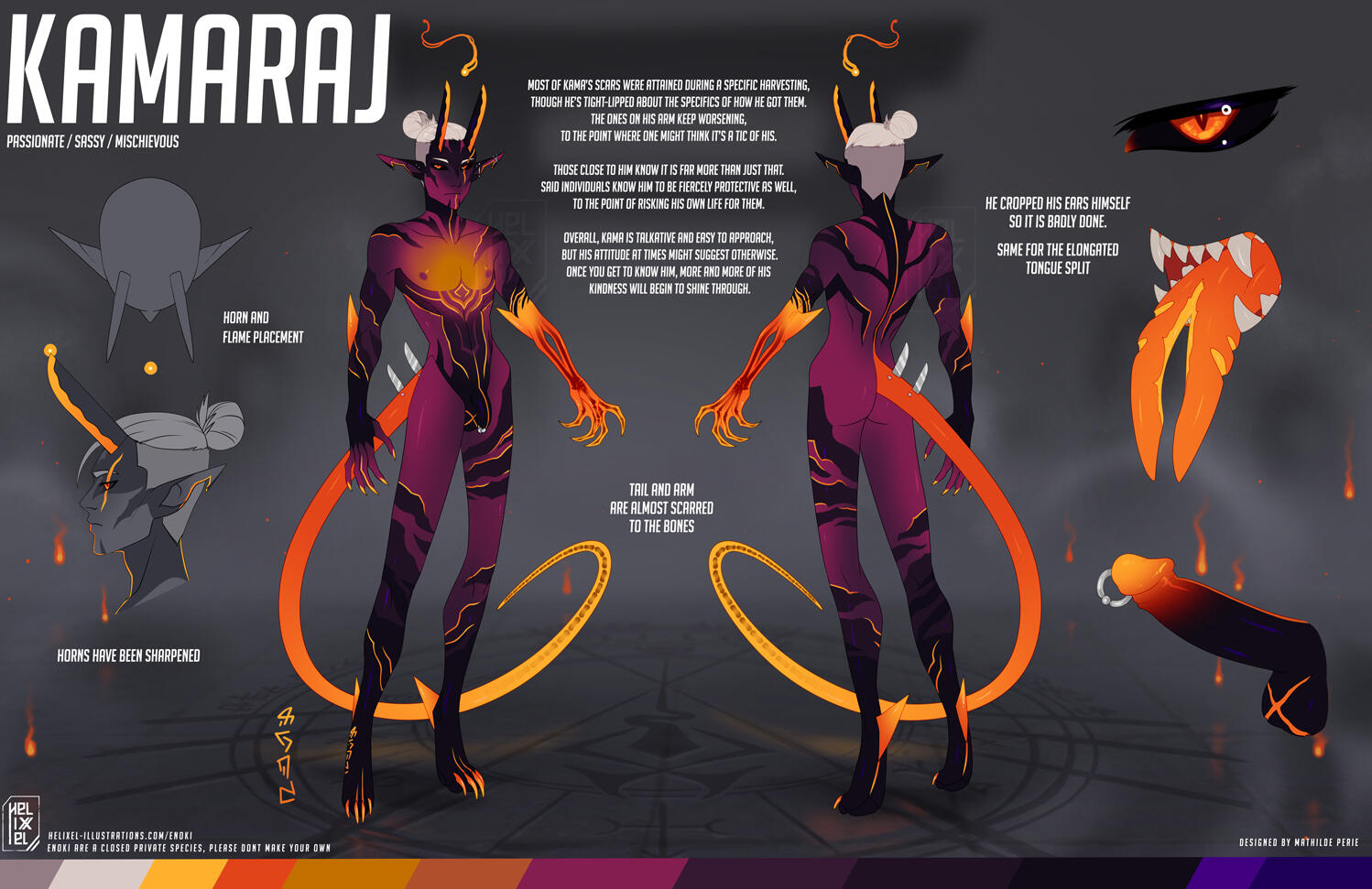 Enoki are humanoid demons with human-like faces and anatomy but distinct demonic traits. They have long tails, pointy ears, sharp teeth, slit pupils, glowing eyes, and white hair. Common features include horns with an eternal flame between the tips and digitigrade legs ending in clawed paws. Some may have hooves or stilted tips instead in some cases!Enoki have vibrant, saturated body colors with intricate, glossy markings that shimmer in the light, although desaturated, black, or white Enoki can also exist. At birth, they emerge colorless from the Waking Spring, with their unique colors and markings appearing after 30 minutes. Colors are entirely random and carry no specific meaning. Although Enoki lack fur or feathers, they often incorporate these materials into their clothing, sourced from lesser demons in their domain.Enoki hair is always white, with a subtle hue reflecting their body color. Their hair is sacred and immune to dyes or magical alterations, but they embrace styling and adornments like jewelry to express individuality. Hair dulling and loss of sheen, turning grayish, can occur in sick or cursed Enoki.Traits are aspects of an Enoki that are given upon design, please consider these things cannot be changed or modified. You can find all of these in the Masterlist of each Enoki.