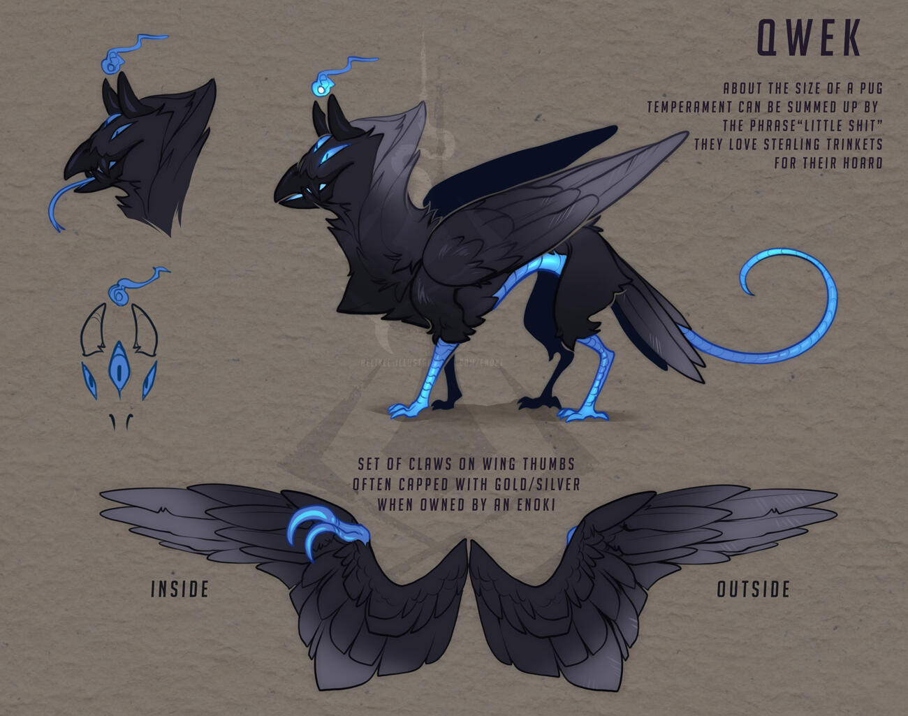 The little shits of the Enoki world, Qwek are mischievous and sassy. Roughly similar in intelligence as a regular corvid on Earth, except it has opposable thumbs. In the wild their scaled sections vary in colour, but often when paired with an Enoki it will match their owners flame colour.Feather colourations are about as varied as Earth corvids as well.