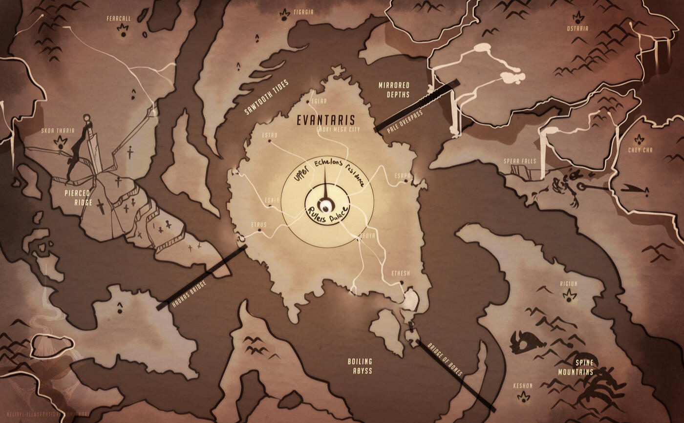 Evantaris, a massive island city and Eclorion’s capital, houses thousands of Enoki, including the ruler’s residence and the Upper Echelons. Three bridges connect the city to other areas, such as the floating islands to the East.Surrounding waters are black and murky, save for the seven magical rivers that flow into bays. These rivers infuse life into the world, reanimating skeletal remains into creatures called Praxi, often formed from mismatched bones.