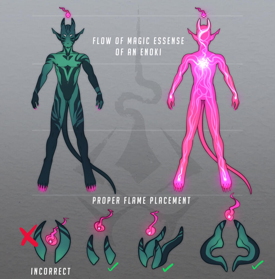 Each Enoki has a flame resting between their horns, near their head. For those with multiple horn sets, the flame stays closest to their skull. The flame contains their magical essence and is not hot to the touch, feeling like a gentle flutter instead.The flame reflects their mood, changing size, crackling, or even altering shape when excited. Some more powerful Enoki can control the appearance of their flame or manifest multiple flames at once.Horns are vital for anchoring the flame. If an Enoki loses their horns (due to punishment, battle, or accident), they must use prosthetics to avoid losing their magic essence. Without horns, their energy gradually dissipates, leading to illness or death over several years.